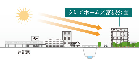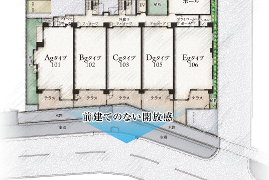 住戸の南側は道路、その先に水路と低層住宅が広がる伸びやかなロケーション。目の前に建物がないため、1 階住戸でも遮るもののない明るさと開放感を確保でき、心地よい日常が叶います。