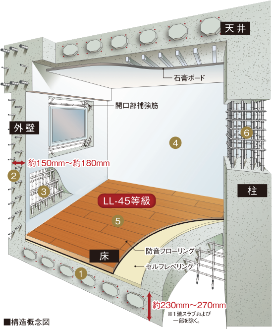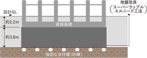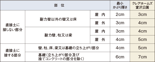 建築基準法で定める「最小かぶり厚さ(部位により20㎜〜60㎜)」より10㎜以上厚くし耐久性を高めています。