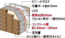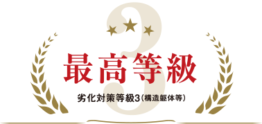 構造躯体等に使用する材料の交換等大規模な改修工事を必要とするまでの期間を伸長するため必要な対策の程度:3(最高等級)通常想定される自然条件及び維持管理の条件の下で3世代(概ね75〜90年)まで、大規模な改修工事を必要とするまでの期間を伸長するため必要な対策が講じられている。
