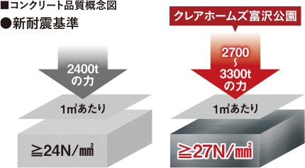 良質な構造躯体をつくるため本体建物主要構造部は、この水セメント比を50%以下に設定しております。コンクリートはセメント、水等からなり、コンクリートと水の比率により、コンクリートの耐久性に違いが出ます。