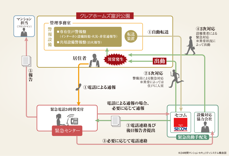 共用部や専有部における各種センサーが異常事態を感知すると、非常警報を遠隔管理センターへ自動的に通報。状況に応じてスタッフが現場に急行し、迅速かつ的確に対応。365日暮らしの安全を常に見守ります。
