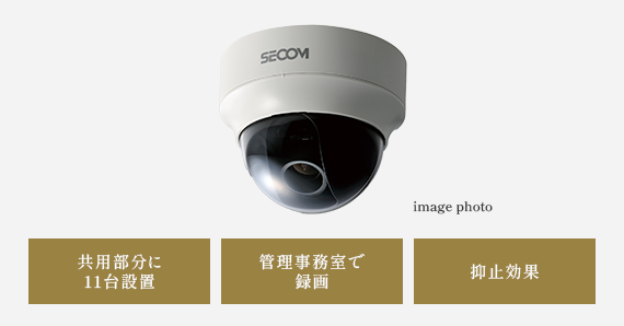 エントランス、駐車場、エレベーターなど、敷地内の共用部分に監視カメラを11台設置。監視映像は管理事務室で録画され、不法行為等に対する抑止効果を高めます。