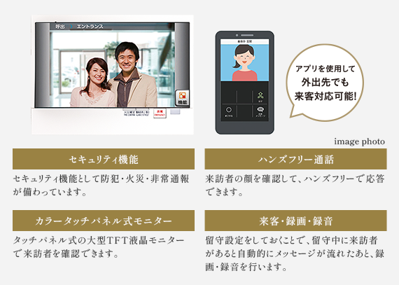 音声と画面でエントランスの来訪者を確認できるカラーTVモニター付インターホンを採用。