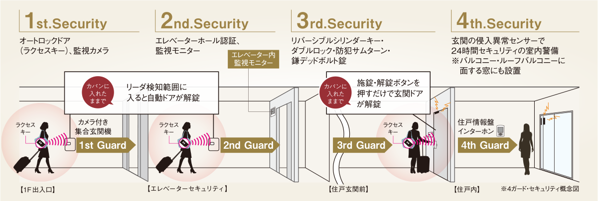 風除室から各住戸内まで、監視カメラやオートロックを設置。不審者の侵入を防ぎ、来訪者を映像と音声でしっかりチェックする4ガードのセキュリティを実施。安心のセキュリティで、都市生活の安全を守ります。